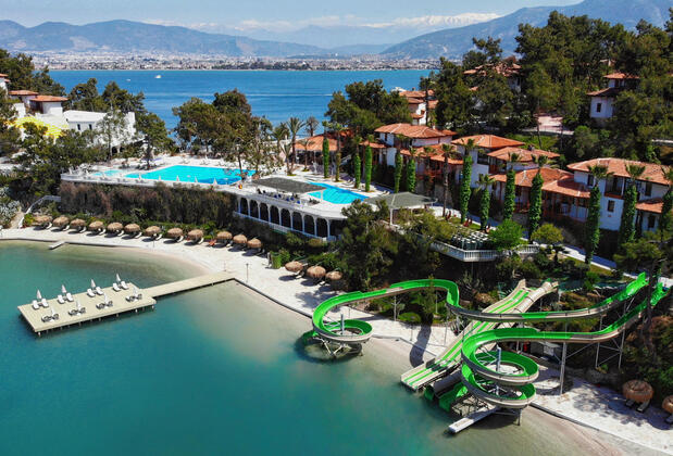 İşlemeli ağaçlardan inşa edilmiş şık bungalovlar ve odalarıyla çok özel bir tatil vadeden tesis, 3 muhteşem koya sahip 2000 metrelik Mavi Bayraklı bir sahille çevreleniyor. İsterseniz uçsuz bucaksız mavilikteki yüzme keyfini farklı konseptlerdeki yüzme havuzlarına taşıyabiliyor, tercihinizi kaydırakların eğlencesinden ya da kuş cıvıltıları eşliğindeki bir sessiz dinlenceden yana kullanabiliyorsunuz.