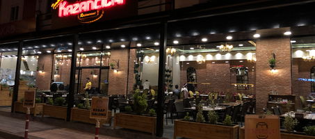 Otoparkı, 600 kişilik kapalı salon, 150 kişilik terası ve bahçesiyle palmiyeler arasında saat 10:00 dan 02:00 ye kadar hizmet veren Kazancılar Kebap, ocakbaşı keyfini de düşünerek ikinci katında kendine yakışır dev mangalını hazır etti.