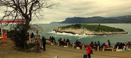 Amasra Ağlayan Ağaç’ın bulunduğu tepe ve dolayısıyla çay bahçesi ise muhteşem bir manzaraya ev sahipliği yapmaktadır. Burada çayınızı yudumlarken Tavşan Adası, Atatürk Tepesi ve Büyük Limanı seyre dalabilir, deniz manzarası sayesinde bütün stresinizden bir anda uzaklaşabilirsiniz. Tam karşınızda yer alan ve tavşanlara ev sahipliği yapan Tavşan Adası’nı izlemek için çay bahçesinden dürbün kiralamak da mümkündür. Dönüş yolunda kurdukları standlarda el emeği ürünler ve birbirinden lezzetli yiyecekler satan yerli teyzelerin hazırladığı reçel ve bal gibi ürünlerden satın alabilirsiniz.
