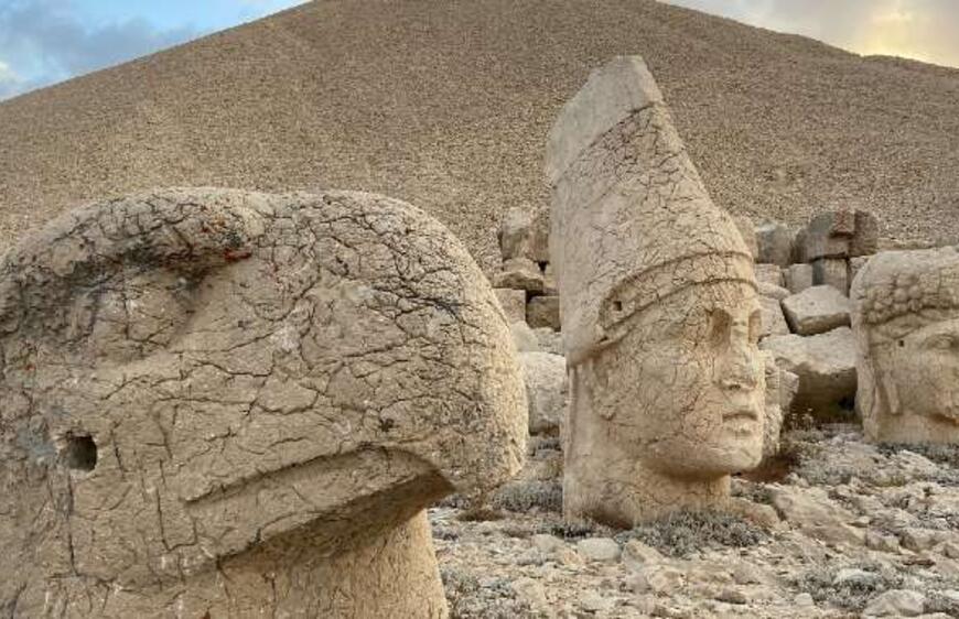 Nemrut Dağı Tümülüsü: Doğu, Batı ve Kuzey teraslardan oluşan bölgede, Doğu ve Batı teraslarında büyük boyutlu taş heykeller, kabartmalar ve yazılar bulunmaktadır. Tanrıların tasvir edildiği bu heykeller arasında Kral I. Antiochos’un da heykeli bulunmaktadır. Teraslarda göreceğiniz Aslan heykeli yeryüzündeki gücü temsil ederken, sonrasında göreceğiniz kartal heykeli göksel gücü temsil etmektedir. Doğu ve Batı terasında bulunan heykel dizileri aynıdır fakat Doğu terasındaki tahtlar, Batı terasında ise heykel başları daha sağlamdır.