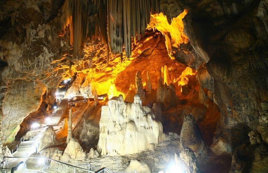 Dar bir geçitten süzülüp geçerek ulaştığınız Büyük Damlataşlar Salonu, mağaranın en geniş ve görkemli bölümü. Düzenli sıralanmış sütunları, parıldayan mağara incileri ve küçük havuzlarıyla adeta bir sanat eseri. Salonun içindeki oksijen miktarının açık havadan 4 kat fazla olması, nefes alırken bile sizi yeniliyor. Kırmızı, sarı, yeşil ve mavi tonlarında parlayan devasa sarkıt ve dikitler, görsel bir şölen sunuyor.