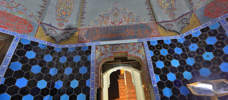 Türbenin içindeki duvarlar, pencere üstüne kadar altıgen çinilerle kaplıdır. Çinilerin üzerinde altın yaldızlı baskı tekniği ile yapılmış motifler bulunmakta olup çiniler lacivert ve turkuaz renge sahiptir. Çinilerin etrafını ise beyaz, lacivert, turkuaz renkte çiçek motifli bordür çevirmektedir. Duvarların üst kısmı ve kubbe çok renkli kalem işçiliği ile bezenmiştir. Kapı ve pencere kapakları ahşap işçiliğinin güzelliğini ortaya koymaktadır ve hepsi orijinaldir.
